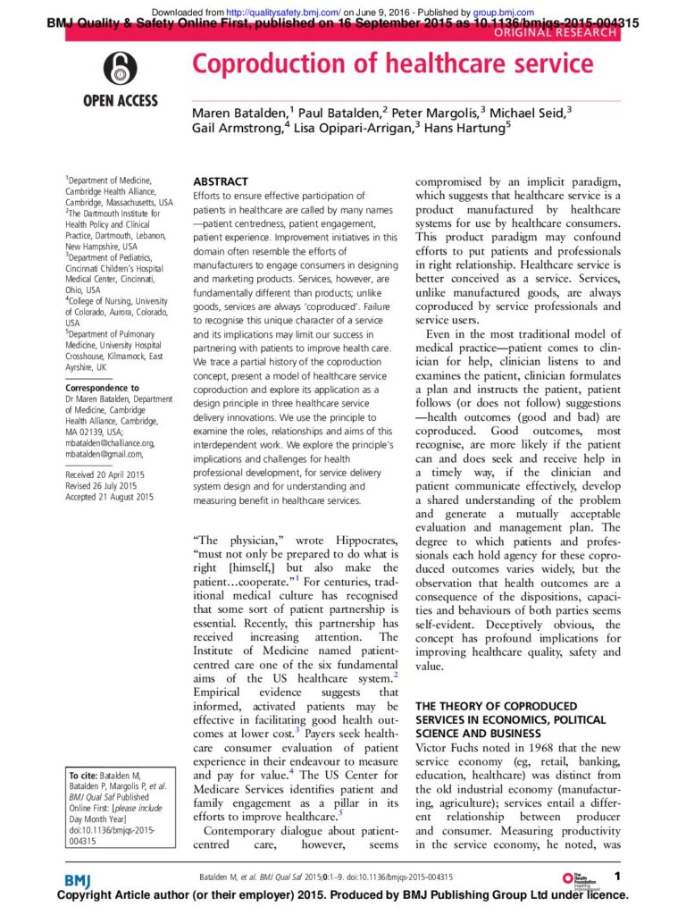 This lively article was written by seven inspiring authors Maren Batalden, Paul Batalden, Peter Margolis, Michael Seid, Gail Armstrong, Lisa Opipari-Arrigan and Hans Hartung with help from BMJ Quality & Safety Online First, this article was published on 16 September 2015.
