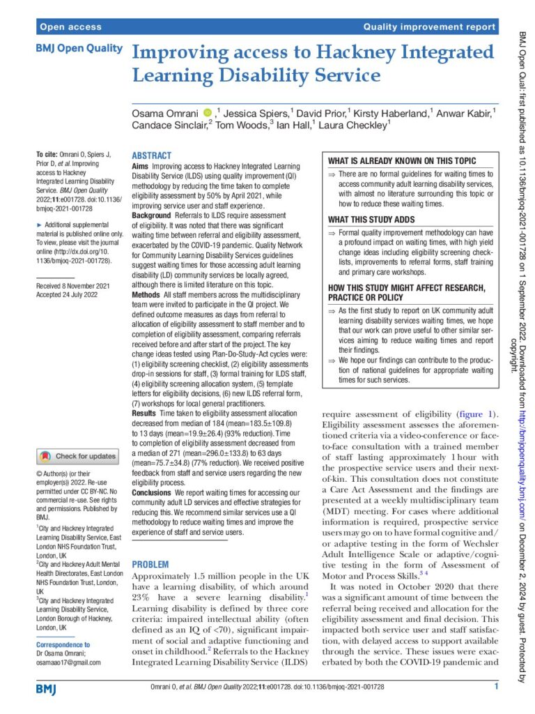 Conclusions: We report waiting times for accessing our community adult LD services and effective strategies for reducing this. We recommend similar services use a QI methodology to reduce waiting times and improve the experience of staff and service users.