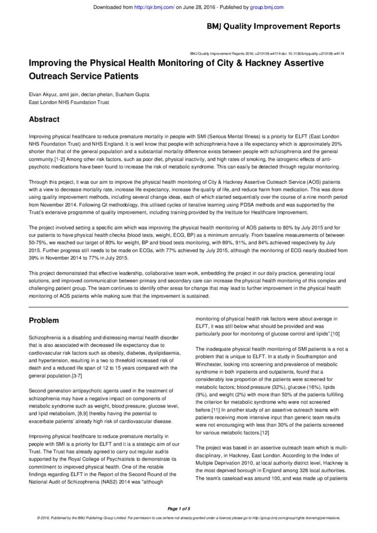 Improving the Physical Health Monitoring of City & Hackney Assertive outreach Service Patients (BMJ Quality)