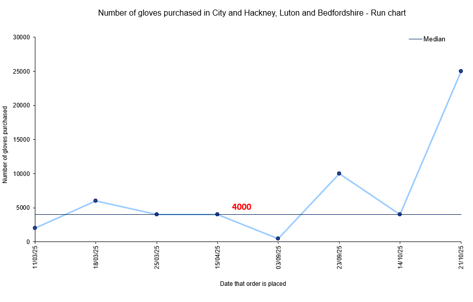Our baseline data is below (Fig 1). Orders for gloves are placed infrequently and when needed, but as you can see from the data, this averages around 4000 gloves per order. Through our improvement efforts we are aiming to reduce this by 20% before July 2026.