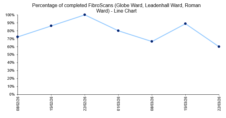Figure 3. Line chart – Percentage of completed FibroScans in Globe Ward, Leadenhall Ward and Roman Ward