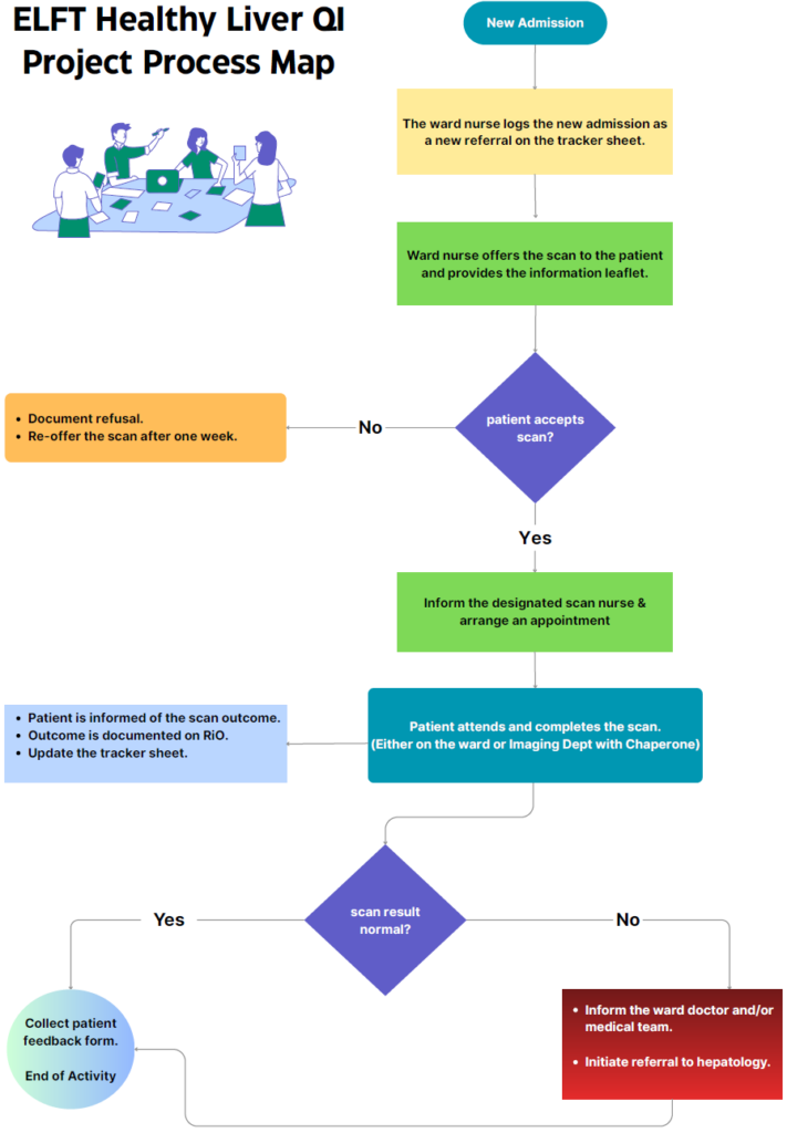 During the project we refined the process of identifying new admissions and offering the scan to patients. In the first cycle of testing, patients were identified, offered a FibroScan, and provided with a patient leaflet at the point of contact to support understanding of the scan. A service user was actively involved in supporting delivery, helping to offer the scan to patients and collecting feedback forms after the scan was completed. Due to staffing constraints, I took on a more active role in identifying patients and offering the scan to ensure continuity.