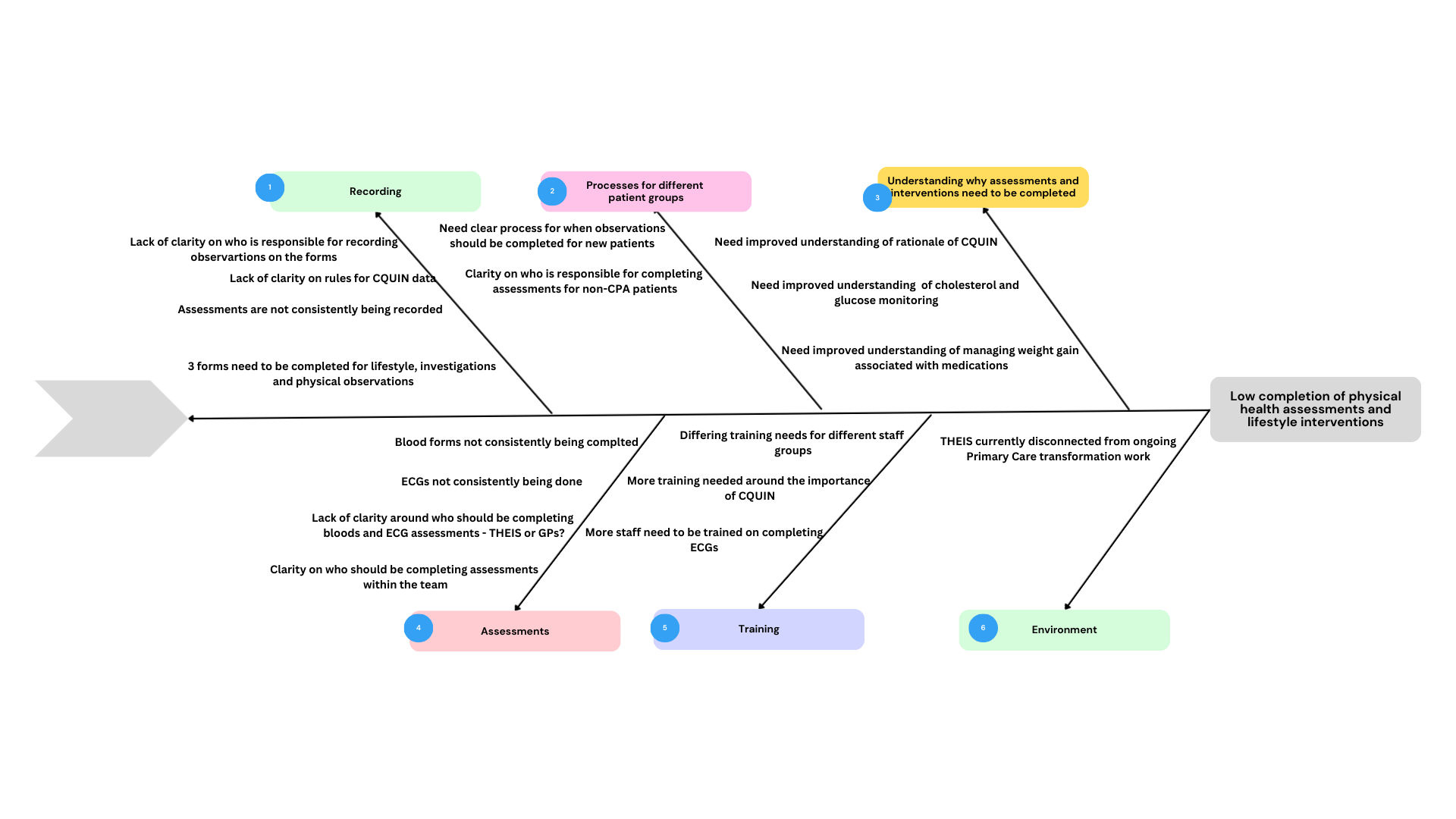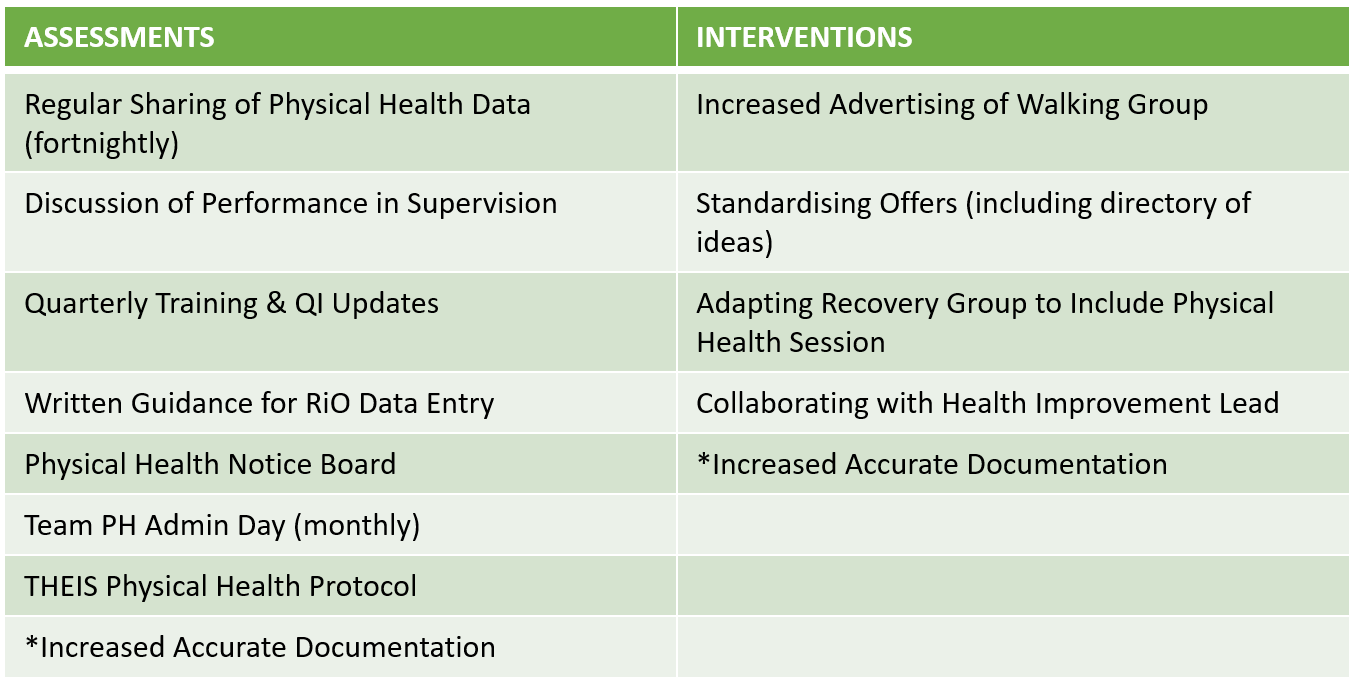 In order to address the gap in the completion of physical health assessments, the team needed to address two key areas: