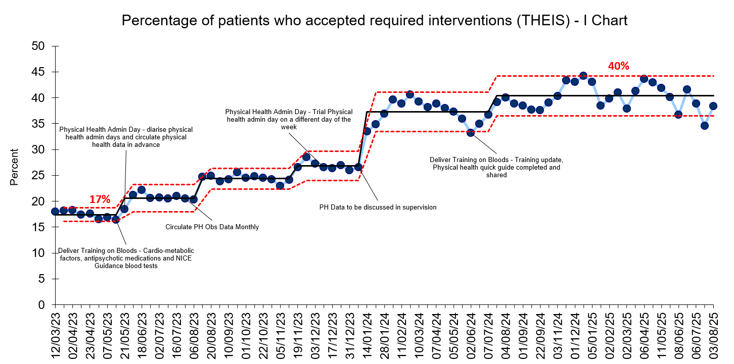 The team saw sustained improvements in both of their outcome measures with an increase in the percentage of completed physical checks from 28% to 53% and an increase in the percentage intervention being accepted from 17% to 40%.