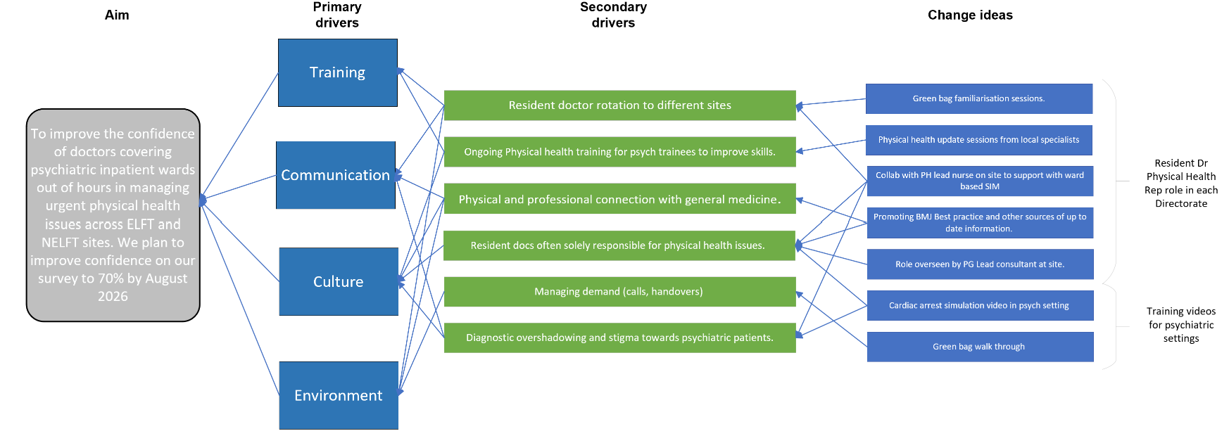 Our change ideas included strengthening links with local acute medical teams, working with locality physical health lead nurses to collaborate with ward based simulation, emergency grab‑bag familiarisation and academic updates on physical health. One of our most successful change ideas has been our development of the role of ‘physical health representative’, held by a resident doctor for six months devised to support their peers to access training and skills for the management of physical health.
