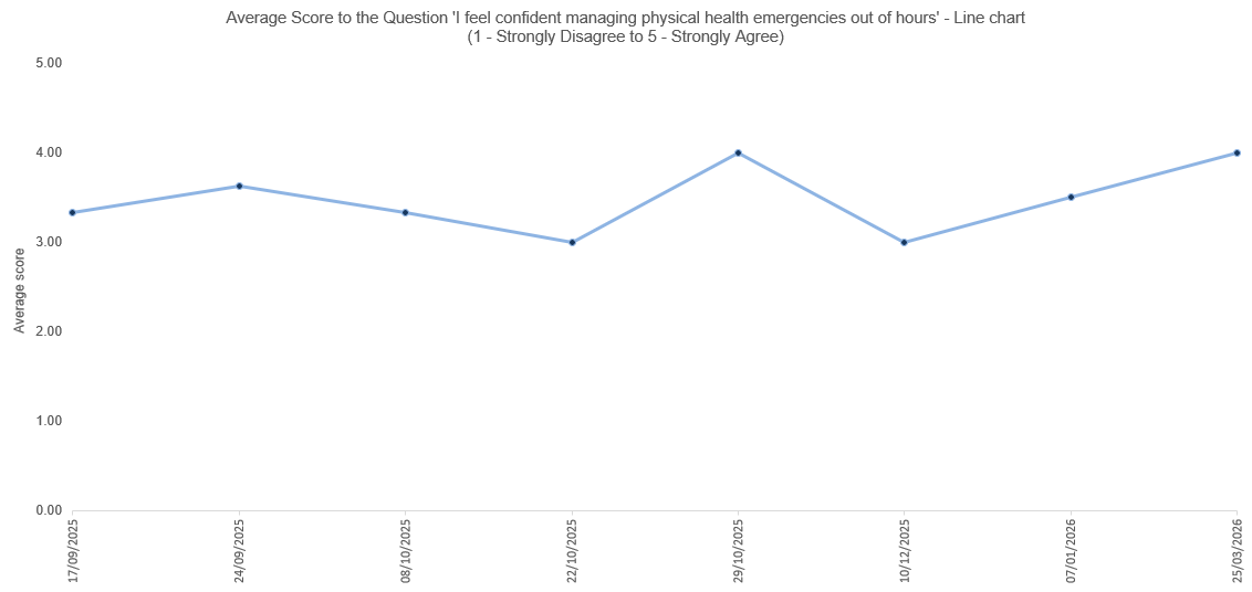 Our outcome measure (the measure directly related to our aim statement) focuses level of confidence around managing physical health emergencies. This is tracked by through a regular survey completed by our physical health reps, and is plotted on the run-chart above (Figure 3). We would like to increase this number to a score of 4 by August 2026.