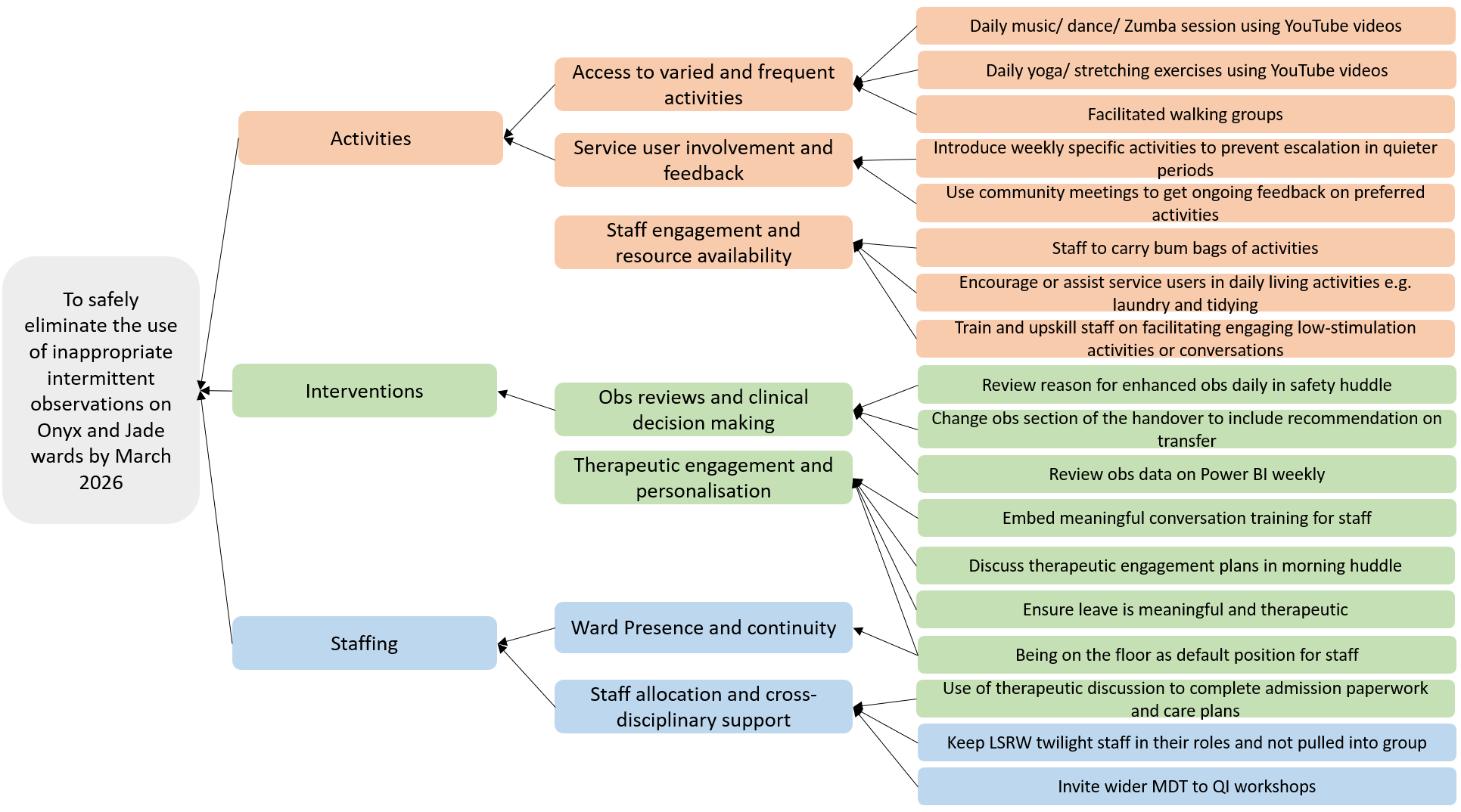 On Jade Ward, the focus has been on creating space for open conversations about observations and engagement. Since July, the ward has been testing the use of community meetings as a regular forum to discuss observations and therapeutic engagement. Service users are invited to share how being on observations feels, ask questions, and suggest activities they would like to see on the ward. The team’s first plan-do-study-act (PDSA) cycle showed that limited time and lack of structured questions reduced feedback, but learning from this cycle has prompted the team to move the discussion earlier in meetings and introduce structured prompts to guide reflection and feedback.
